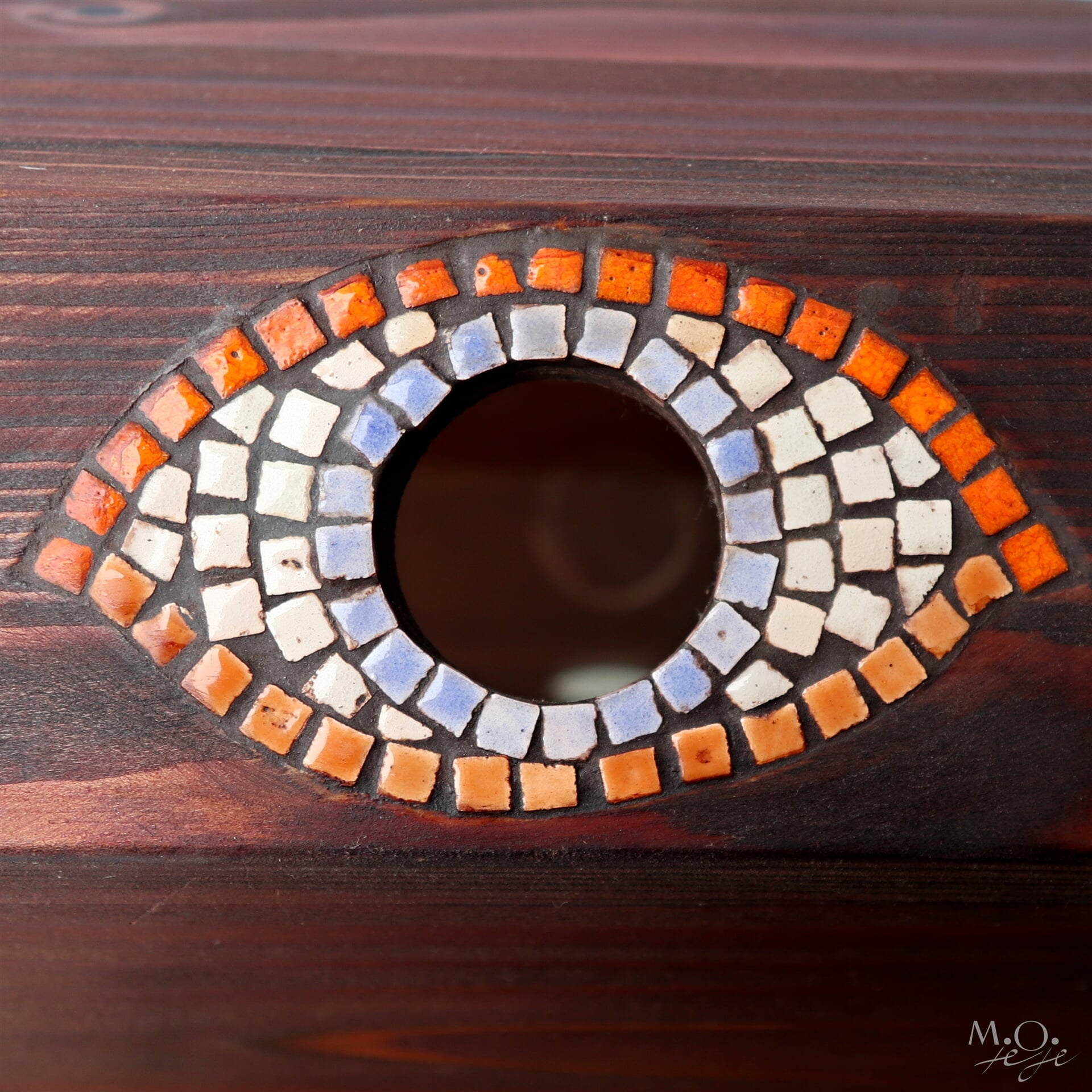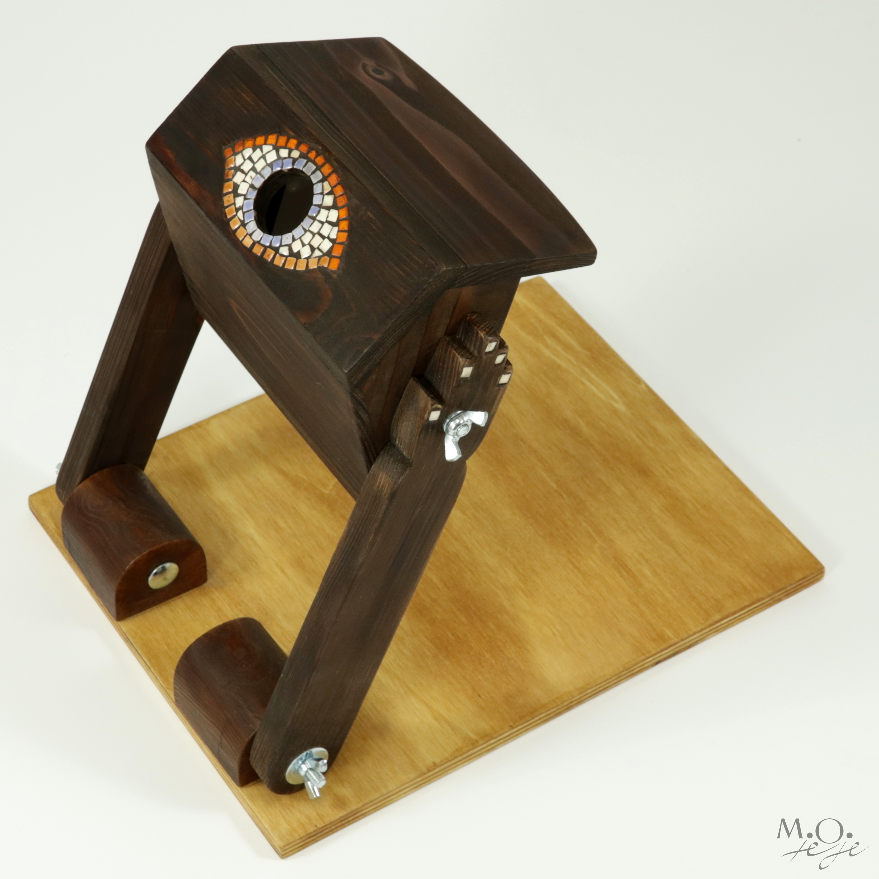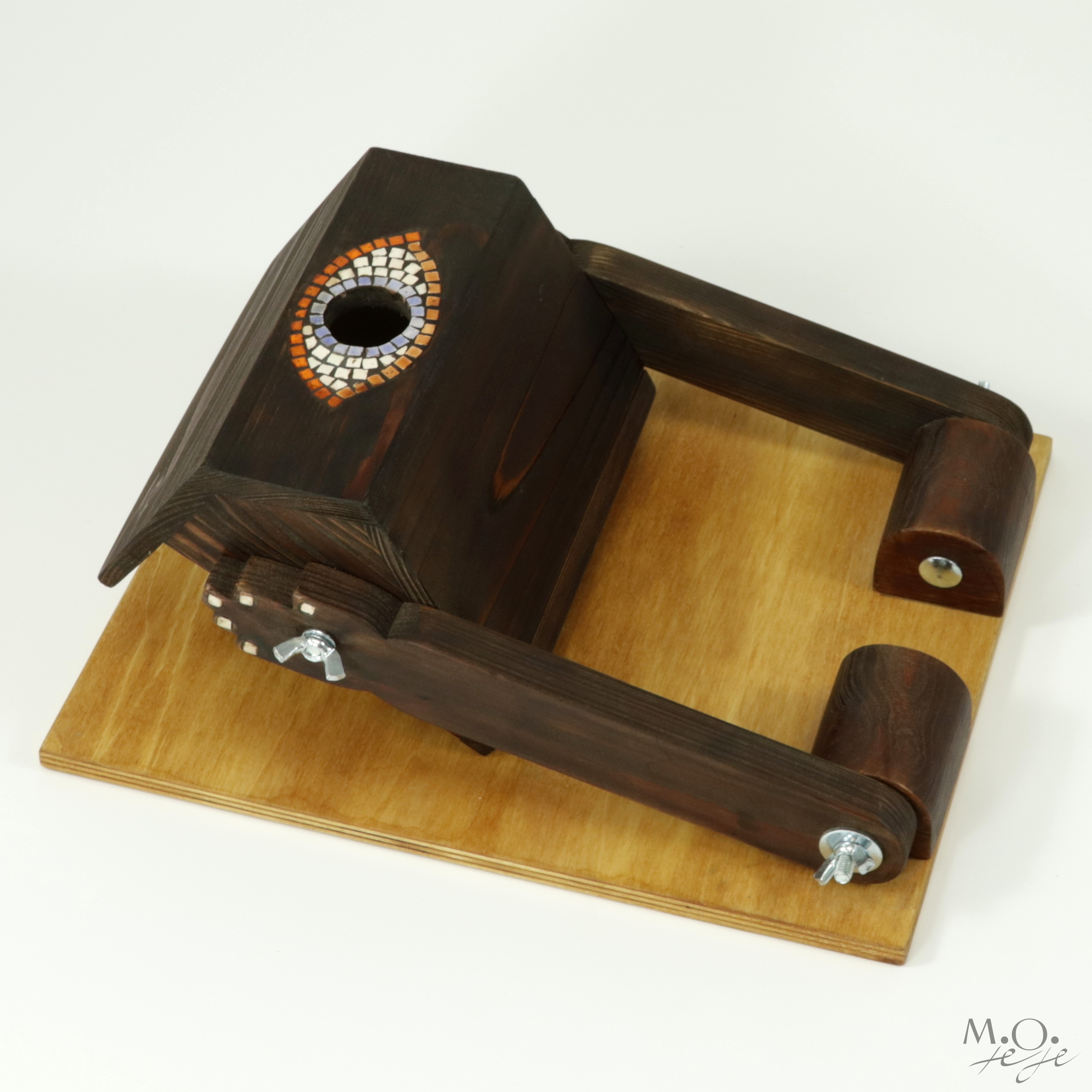 Jedná se o originální autorský kus, ručně vyrobený ze dřeva, doplněný vkládanou keramickou mozaikou (inkrustace). Je navržen s důrazem