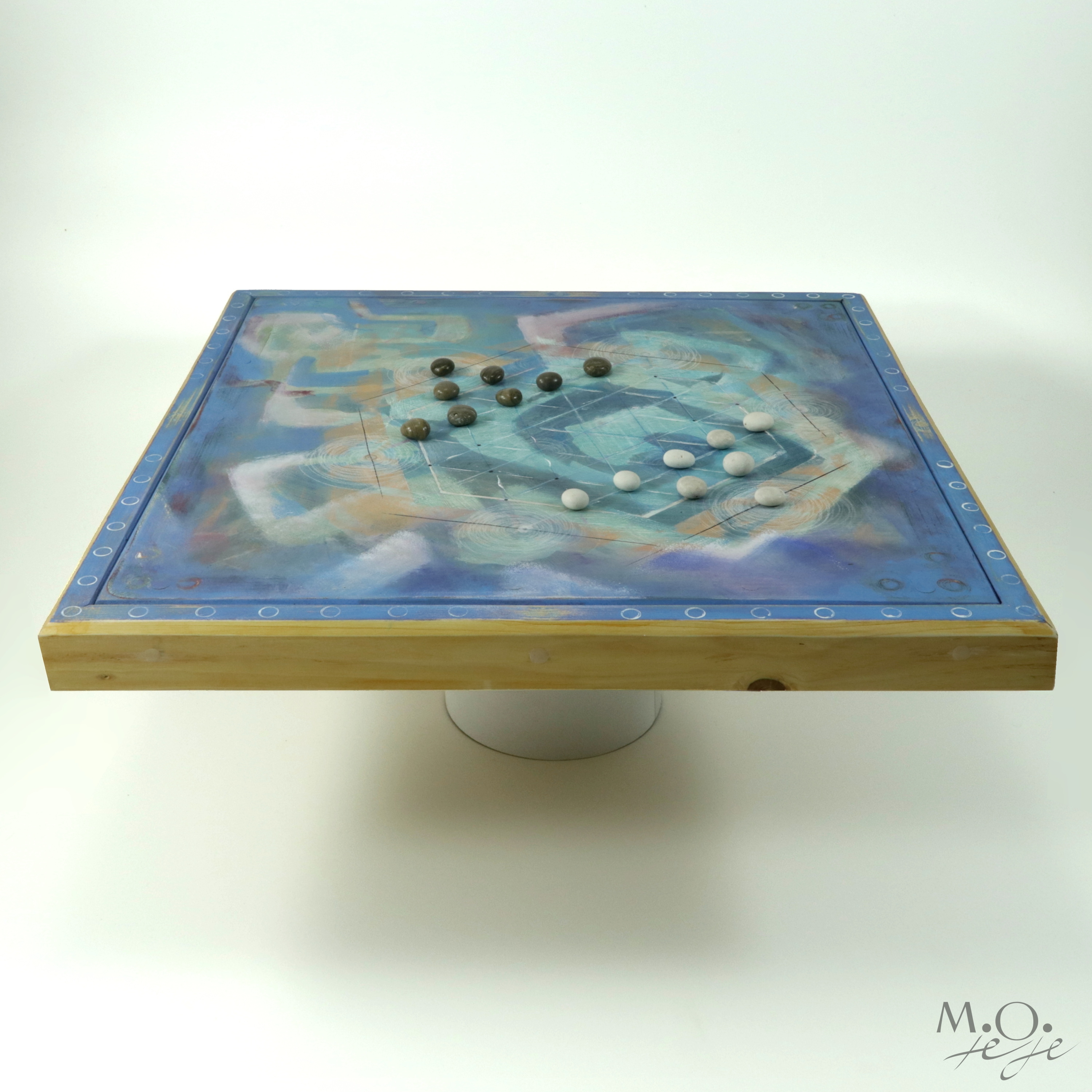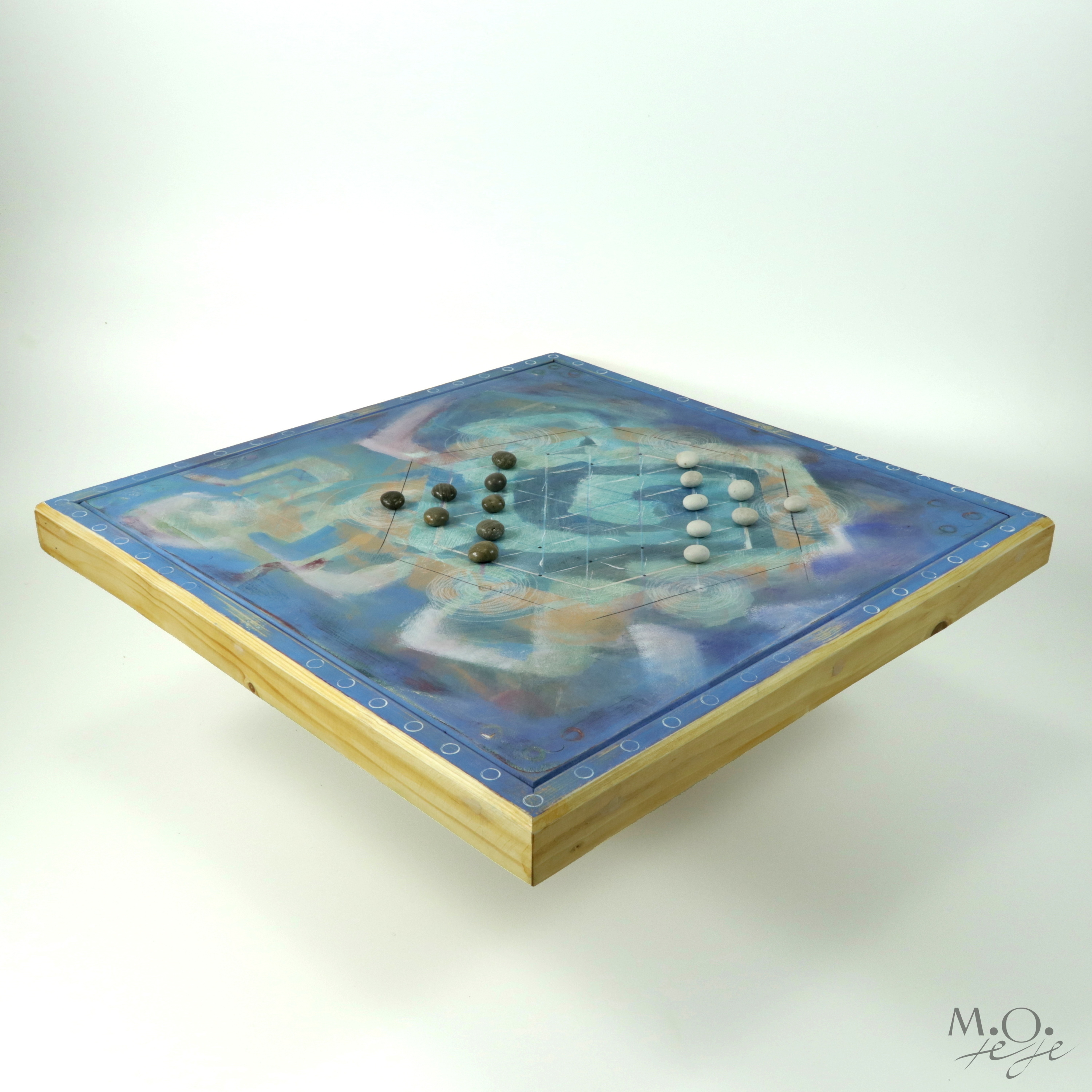 Ručně vyrobený originál jediný a neopakovatelný kus, pečlivě namalovaný akrylovými barvami a ošetřený závěrečným lakem. Deska hry využívá mnohovrstvenou lazurní malbu, což podporuje pocit hry v krajině obrazu. Součástí hry jsou přírodní kameny.